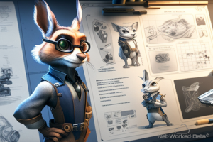 A fox drawing with a compass on a huge blueprint