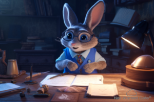 A rabbit drawing a blue plan on a large desk