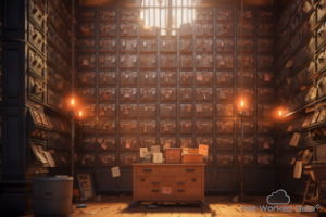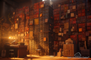A very big and long old filing cabinet on the wall, with opened drawers and lot of papers everywhere
