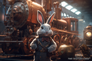 A rabbit mechanic in front of a locomotive